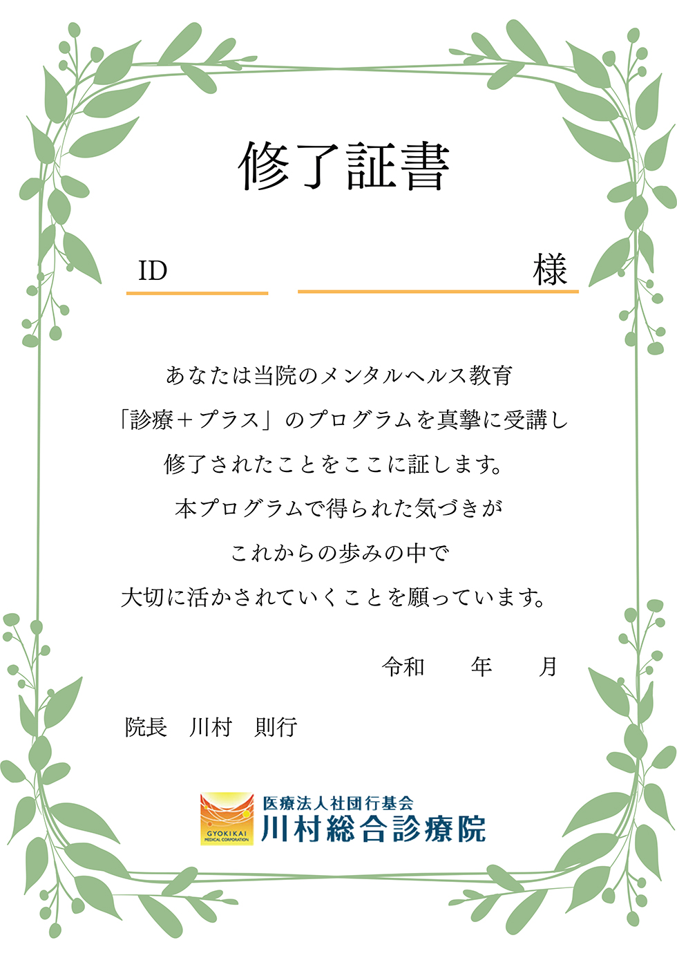 修了証書は集団精神療法心理教育プログラム「診療+プラス」1クール12回の内10回以上終了された方にお渡ししています。